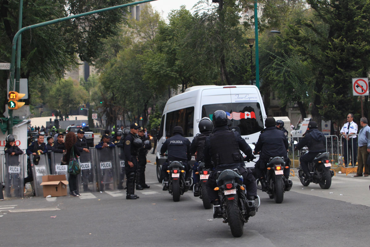 Senadores entran custodiados por policías ante el bloqueo de maestros. Foto: Miguel Dimayuga