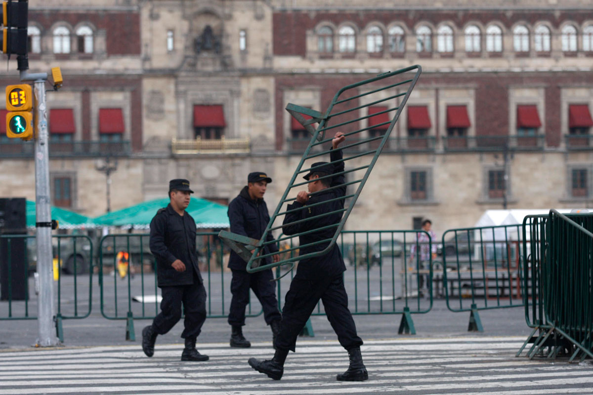 Elementos del Estado Mayor acomodan vallas alrededor del Zócalo. Foto: Hugo Cruz