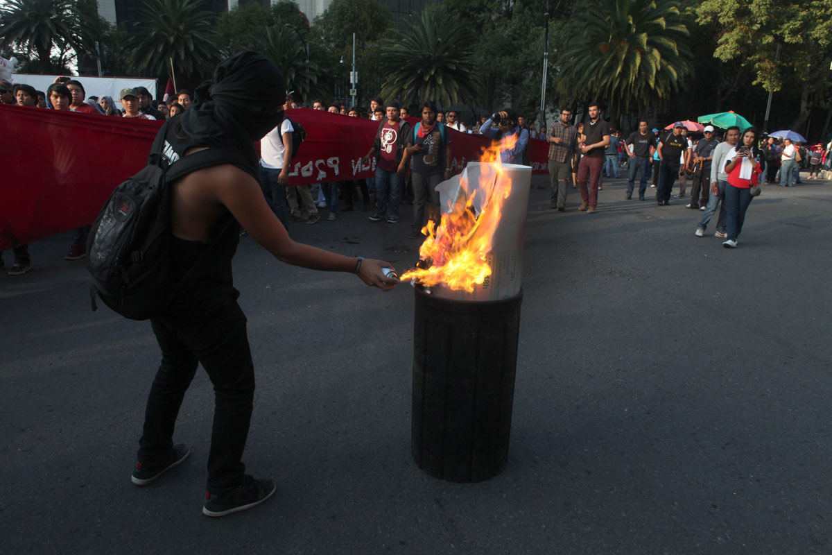 Una anarquista incendia basura en avenida Reforma. Foto: Benjamin Flores