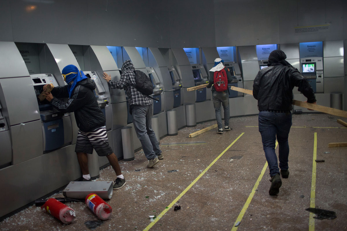 Anarquistas intentan abrir los cajeros de un banco en Brasil. Foto: AP