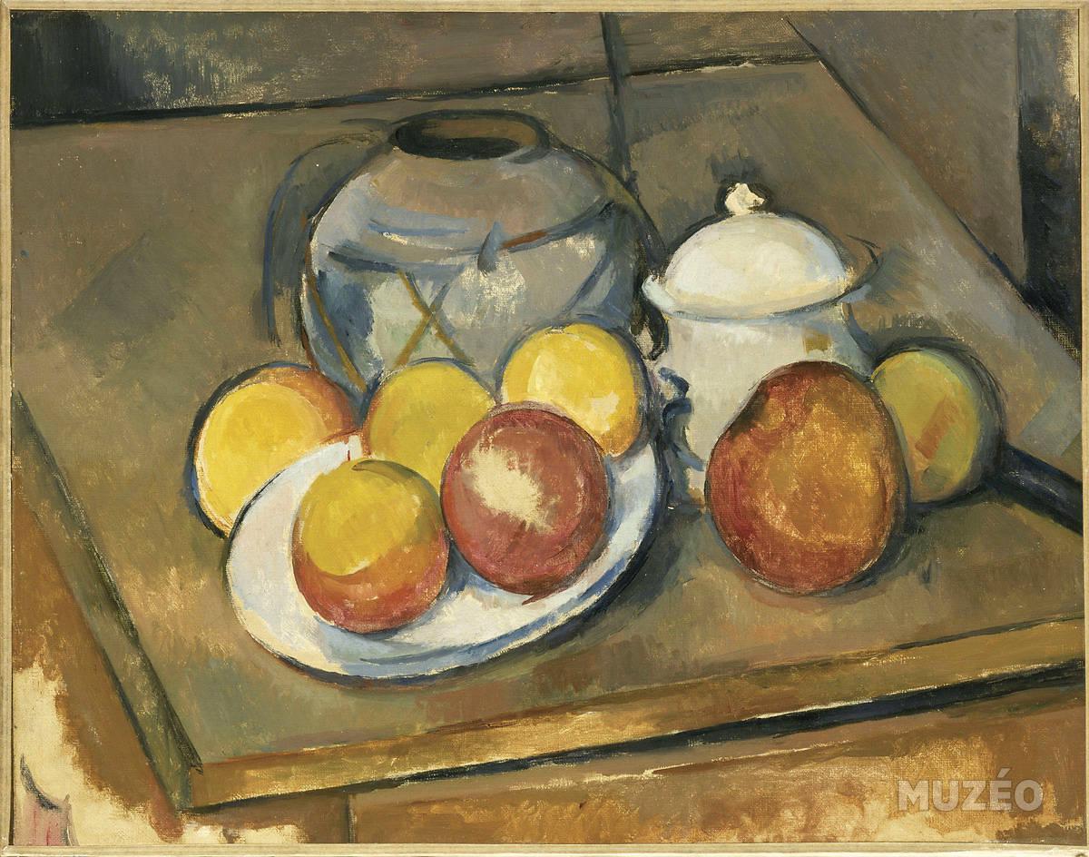 Paul Cézanne. Jarrón con funda de paja, azucarero y manzanas. 1890-1893. Óleo sobre lienzo.
