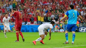 Eduardo Vargas, de Chile, celebra su anotación contra España. Foto: AP / Bernat Armangue