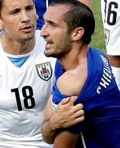 Chiellini muestra la mordida de Luis Suárez al árbitro. Foto: AP / Hassan Ammar