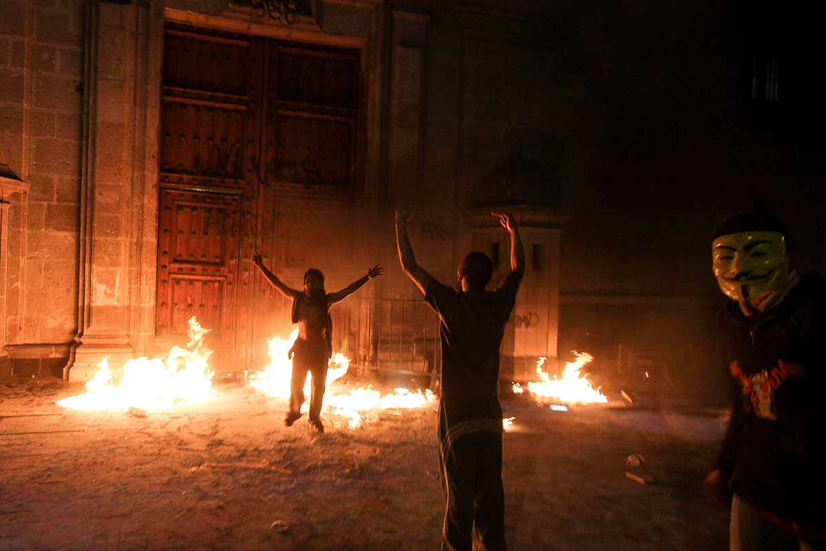 Queman puerta de Palacio Nacional durante protesta por Ayotzinapa. Foto: José Luna