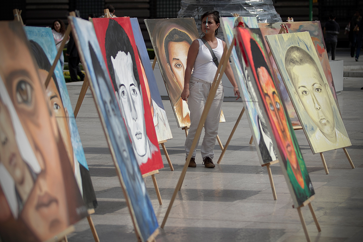 Pintan retratos de normalistas desaparecidos en Bellas Artes. Foto: Xinhua / Alejandro Ayala