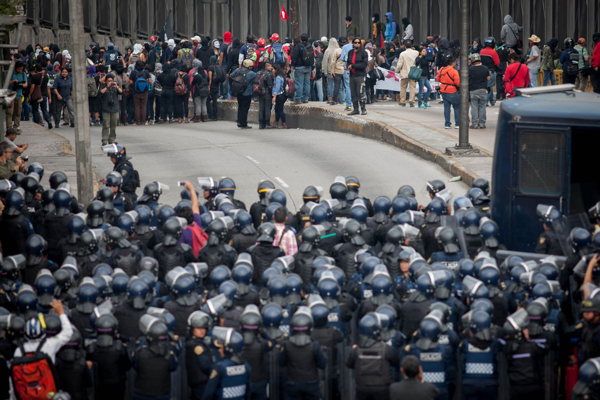 Policías granaderos bloquean paso rumbo al aeropuerto. Foto: Xinhua / Pedro Mera