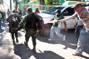 Normalistas se lanzan contra militares en la sede de la Fiscalía de Guerrero. Foto: Germán Canseco
