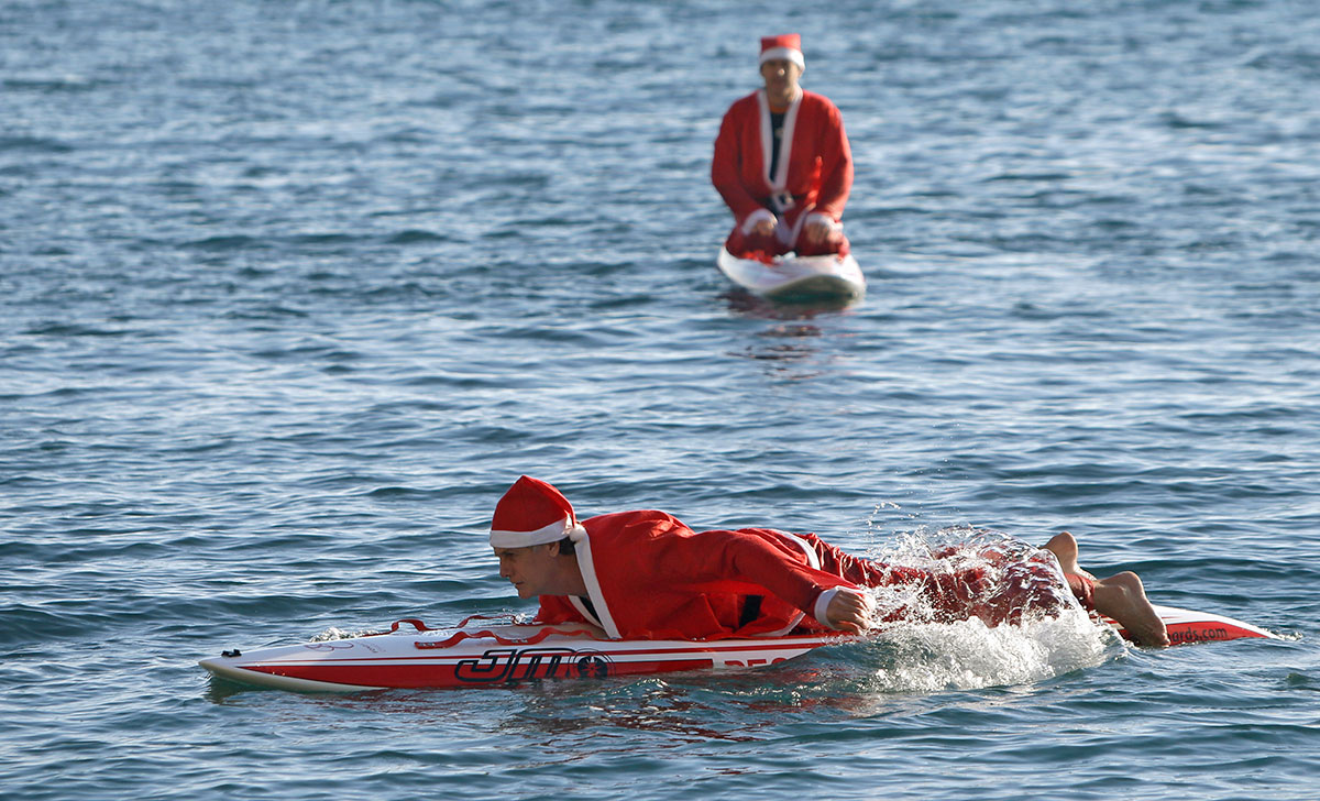 Santa Claus surfea en Mónaco, Italia. Foto: AP / Lionel Cironneau