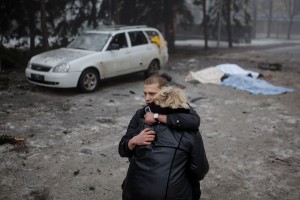 Un rebelde consuela a la esposa de un hombre muerto tras un bombardeo en Donetsk, Ucrania. Foto: AP