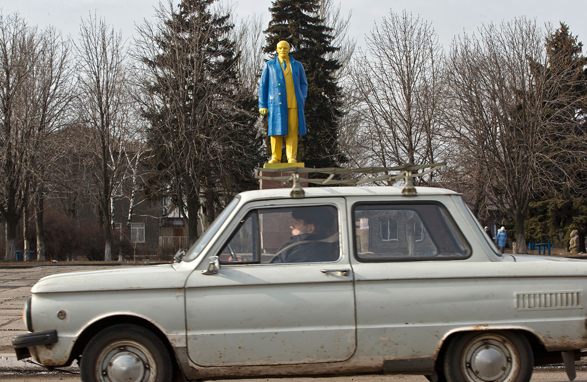 Una estatua de Lenin pintada con los colores en la bandera ucraniana. Foto: AP