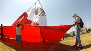 Familiares de normalistas arrían la bandera de México en Iguala, Guerrero. Foto: Miguel Dimayuga