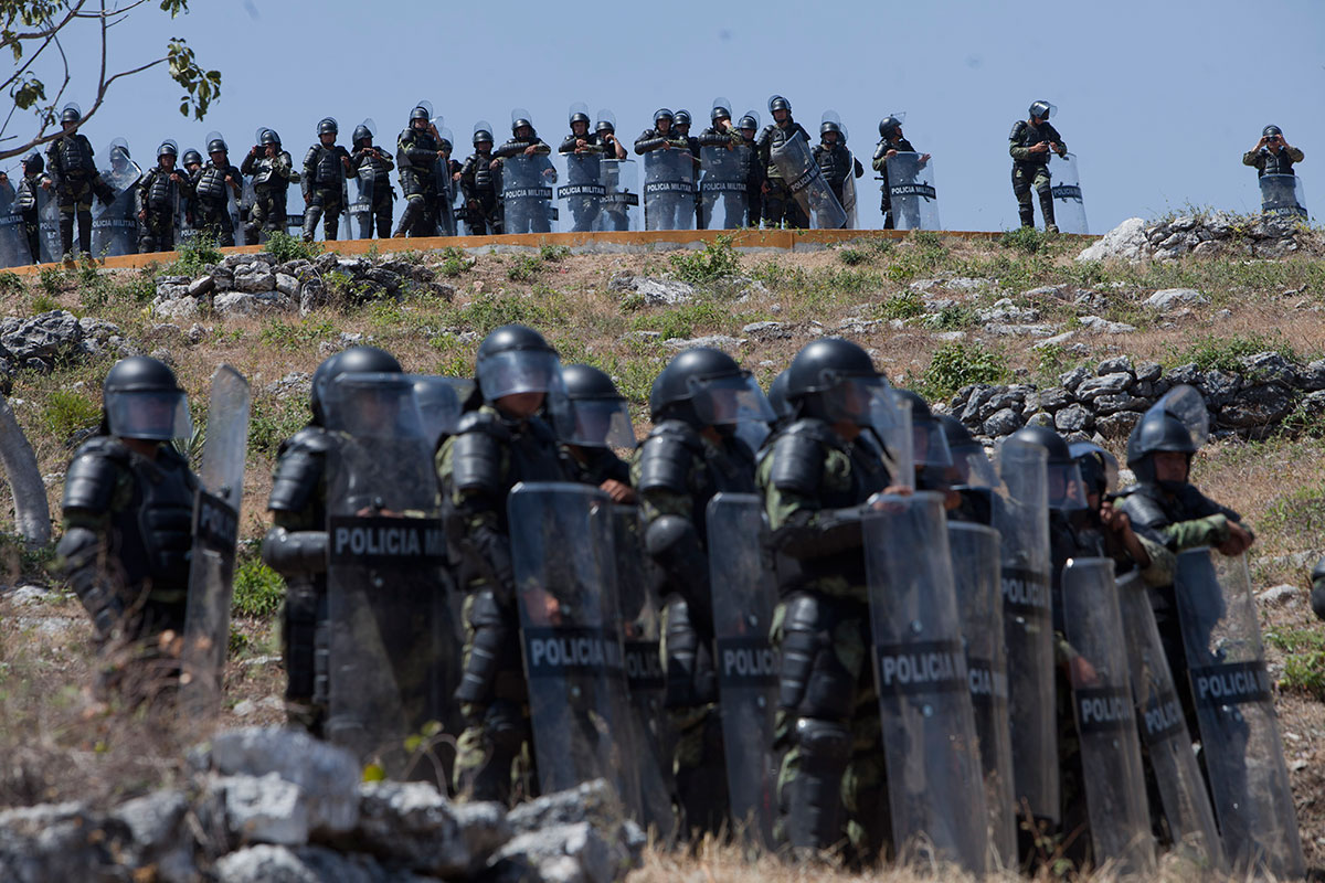 Policías vigilan a familiares de normalistas en Iguala, Guerrero. Foto: Miguel Dimayuga