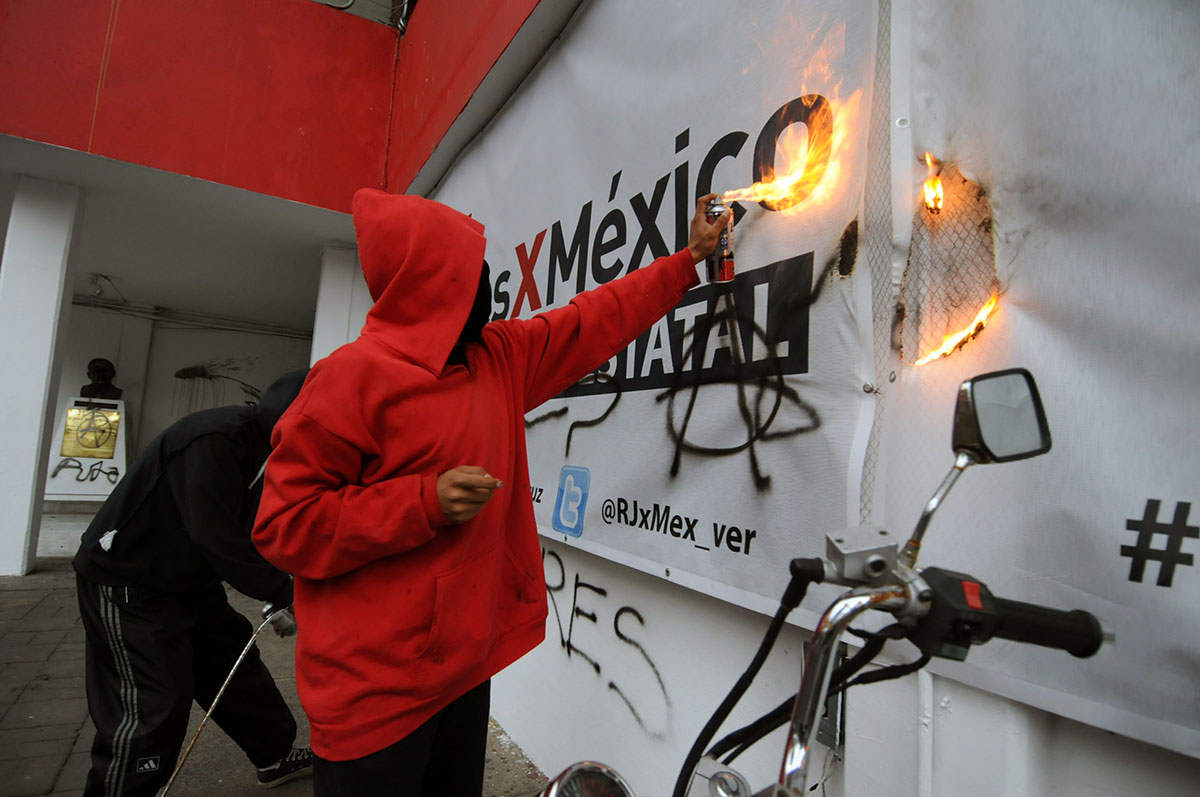 Encapuchados incendian sede del PRI en Veracruz. Foto: Rubén Espinosa