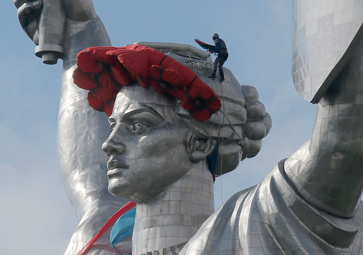 Un trabajador coloca una corona de amapolas al monumento a la Patría en Kiev. Foto: AP / Efrem Lukatsky