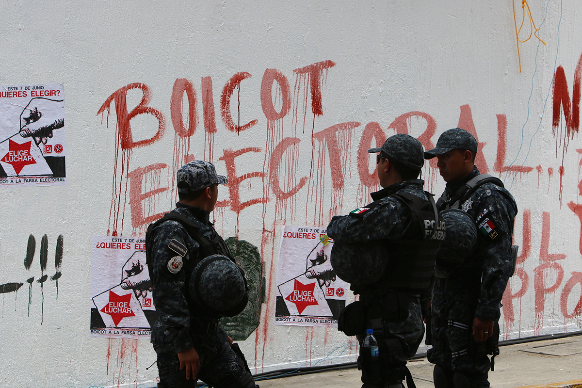 Policías resguardan instalaciones del INE en Oaxaca. Foto: Hugo Cruz
