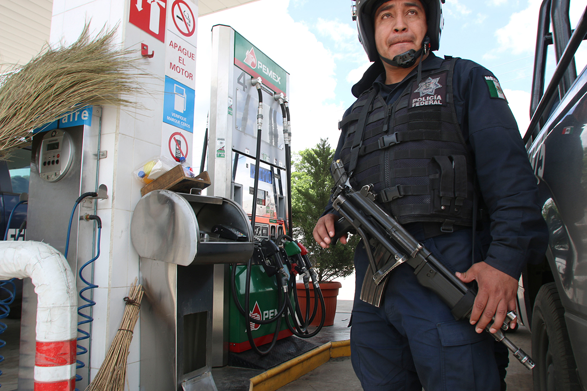 Policías resguardan gasolinerías en Oaxaca. Foto: Hugo Cruz