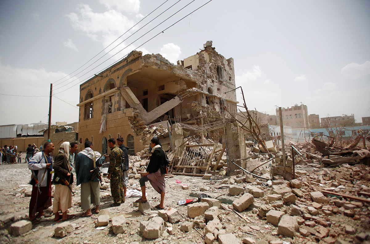 Rebeldes chiítas frente a una vivienda destruida por los bombardeos de Arabia Saudí en Sanaa, Yemen. Foto: AP / Hani Mohammed