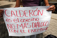 Indignados, los jóvenes reprobaban a gritos la reunión de Calderón con Sicilia y demás representantes del Movimiento por la Paz con Justicia y Dignidad. Además, criticaron a la presidenta de la asociación civil “Alto al secuestro”, Isabel Miranda de Wallace, y al representante de SOS-México, Alejandro Martí.