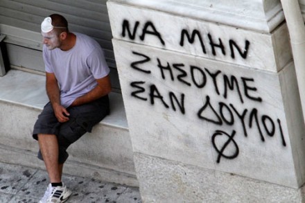 Protestas en Grecia dejan 24 heridos y 22 detenidos. La pinta dice: “No viviremos como esclavos”. Foto: AP
