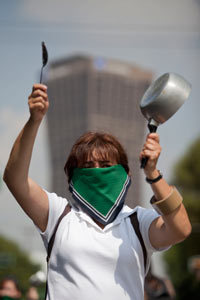 Por la mañana, un grupo de mujeres sobrecargos y esposas de pilotos se manifestaron afuera de la Torre de Mexicana de Aviación. Hicieron sonar cacerolas y utensilios domésticos para demandar solución al conflicto de Mexicana de Aviación, en concurso mercantil que podría ser resuelto el 9 de agosto, días antes de que se cumpla un año de que la aerolínea dejó de volar.