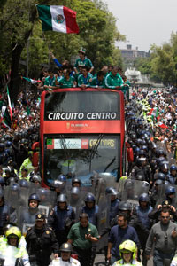 A bordo de un turibús, cuerpo técnico, jugadores y familiares recibieron al paso de la multicolor caravana vítores y cánticos del “Cielito lindo”, del “olé, olé…” y hasta del ya famoso grito del “¡Fúa!”.