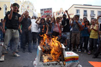 Luego de marchar por la avenida Manuel Ávila Camacho, una de las principales arterias de la ciudad, los universitarios arribaron al centro histórico de esta capital, donde quemaron un ataúd con la imagen del gobernador Javier Duarte, bajo el grito de “Ni un peso más”, y también lo acusaron de engañar y abusar del pueblo veracruzano con el aumento del trasporte en vacaciones.