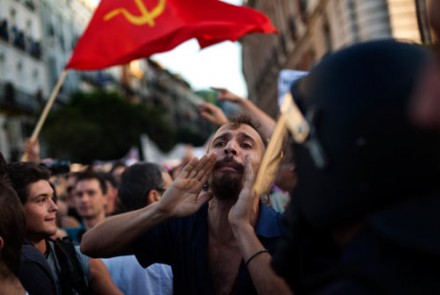 España. Protestan opositores a la visita papal en la Plaza del Sol. Foto: AP