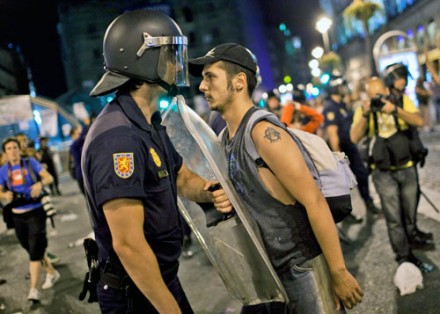 España. Protestan opositores a la visita papal en la Plaza del Sol. Foto: AP