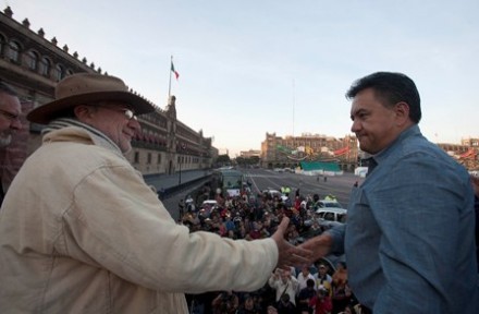 Momentos antes se reunió con los trabajadores del SME que realizan un plantón permanente en el zócalo, a quienes pidió unidad para luchar por la justicia en el país.