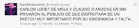“CARLOS LORET DE MOLA Y CLAUDIO X ANOCHE EN IMX PRIVARON AL PÚBLICO DE QUE DISFRUTARA DE UN SKETCH MUY IMPORTANTE POR SU IGNORANCIA Y FALTA..” (sic), publicó en su cuenta de Twitter.