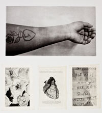 Concebido como un conjunto de metáforas que presentan y evocan actitudes, creencias e imposiciones del poder relacionados con el acto de migrar, el proyecto Frontera herida se inició con experiencias directas que tuvo la artista con jóvenes de 13 a 17 años en un albergue gubernamental para deportados en Nogales, Sonora. Un lugar en el que la desesperación, el miedo y la desesperanza se materializan como huellas en heridas corporales por tratar de saltar las púas fronterizas, pies lacerados por las caminatas, escapularios sudados, crucifijos, sellos de repatriación y listas de objetos consignados. Fotografiadas, fotocopiadas y convertidas en gráficas intervenidas e imágenes heliográficas que transitan de la bidimensión a la tridimensión objetual, las huellas de los migrantes se convierten en presencias perturbadoras que oscilan entre el dramatismo, la nostalgia, la realidad y la ficción.