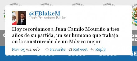 “Hoy recordamos a Juan Camilo Mouriño a tres años de su partida, un ser humano que trabajó en la construcción de un México mejor”, refirió Blake.