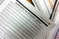 MÉXICO, D.F. (apro).- Miembros de la organización Plataforma de Profesionistas y Técnicos AC (Plaptsac) exigieron al secretario de Gobernación, Alejandro Poiré, que defienda la laicidad del Estado ante la intromisión de la Iglesia católica en la vida política del país.