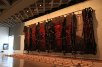 Elaborada en el sitio específico con el apoyo de la también artista en fibras Marta Palau, la espectacular pieza de 5.50 metros de altura por 13 metros de largo, sobresale por su potente y dramática fuerza expresiva. Configurada en dos planos en los que se confrontan hilos y cuerdas de henequén con fragmentos tejidos y entorchados en lana y algodón, la también denominada escultura blanda se significa a través de metáforas matéricas y cromáticas que se reducen al rojo, negro y algunos ocres y marrones. Diseñada temáticamente en relación con el Muralismo y la Revolución Mexicana, la instalación rebasa toda localidad percibiéndose como una obra que presenta la brutal homogeneidad de la violencia, represión y ensangrentamiento humano.