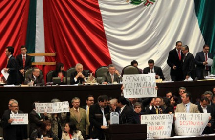 MÉXICO, D.F. (Proceso).- La manera abrupta y contradictoria con la que actuó para reformar el artículo 24 de la Constitución, exhibe una vez más los afanes de la clase política por congraciarse con la jerarquía católica. Con madruguetes y artificios legislativos, tal como ocurrió con las reformas en las 19 entidades en las que se repenalizó el aborto en 2009, se evita el debate y se impone el albazo.