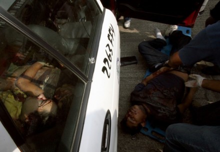 La foto, que fue presentada al concurso organizado por la agencia francesa AFP, recoge una escena en la que un grupo de forenses analizan seis cadáveres que fueron dejados en el interior de un taxi en el puerto de Acapulco, Guerrero.