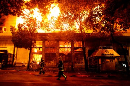 Los saqueos se propagaron por todo el centro de Atenas y al menos 48 edificios fueron incendiados en medio de protestas masivas, entre ellos una sucursal bancaria, dos salas de cine cerrada, una concesionaria de teléfonos celulares, una tienda de cristalería y una cafetería, informó el Departamento de Bomberos.