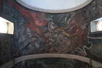 Las zonas decoradas fueron bóvedas y muros; lo más elaborado es el coro y la primera bóveda de la nave. Es en el coro donde arranca la amarga composición: una deidad aparece rodeada por seres humanos alados. Uno de estos ángeles ata al Demonio, otro desata a Satán que simboliza el dolor humano. Una filosa espada asoma por la boca de la deidad. Al ser amarrado el Diablo retuerce su cuerpo monstruoso. Su cabeza cae al suelo, mientras las patas con sus garras se levantan, dejando ver un sexo en forma de cabeza quizás humana. Satán es representado en forma multidimensional en actitudes que van del espanto al horror.