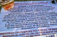 Las narcomantas fueron localizadaos en la carretera Chapala-Jocotepec, carretera a Chapala, a la altura del Boom Boom, en Lázaro Cárdenas y Revolución, en Avenida Tonalá y Tonaltecas, en Avenida Alemania, en la carretera a Morelia a la altura de La Tijera, así como en el centro de Jocotepec, en la colonia Guadalupana de Tlaquepaque, en una colonia de Tepatitlán, y en la colonia Santa Paula, Tonalá.