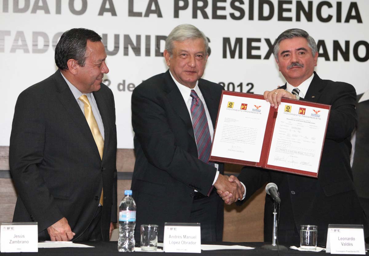 Así terminó Andrés Manuel su turno al micrófono, durante el acto protocolario de solicitud de registro, ante el Instituto Federal Electoral (IFE), como candidato a la Presidencia de la República por el Movimiento Progresista, coalición formada por los partidos de la Revolución Democrática, del Trabajo y Movimiento Ciudadano (MC).