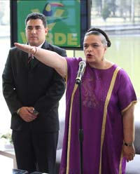 MÉXICO, D.F. (apro-cimac).- Ataviada con un huipil morado con bordados de pavorreales y con un discurso dedicado a la defensa del medio ambiente, la exlíder nacional priista, Beatriz Paredes, rindió protesta como candidata al gobierno del Distrito Federal por el Partido Verde Ecologista de México (PVEM).