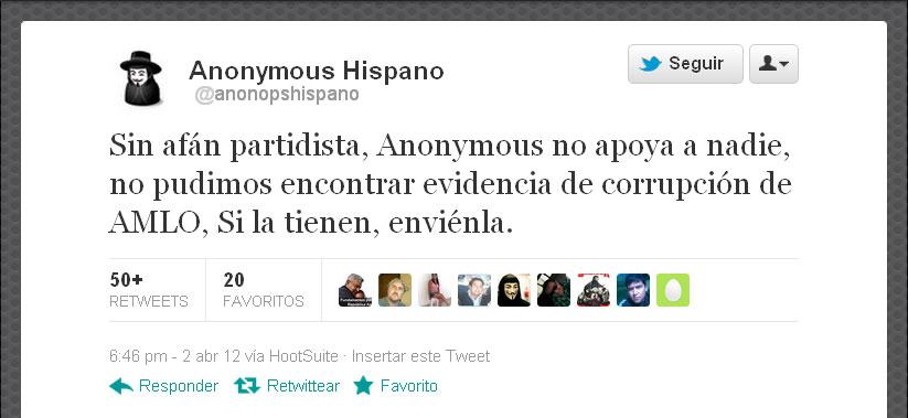 “Sin afán partidista, Anonymous no apoya a nadie, no pudimos encontrar evidencia de corrupción de AMLO, Si la tienen, envíenla”, escribieron en su cuenta los hackers.