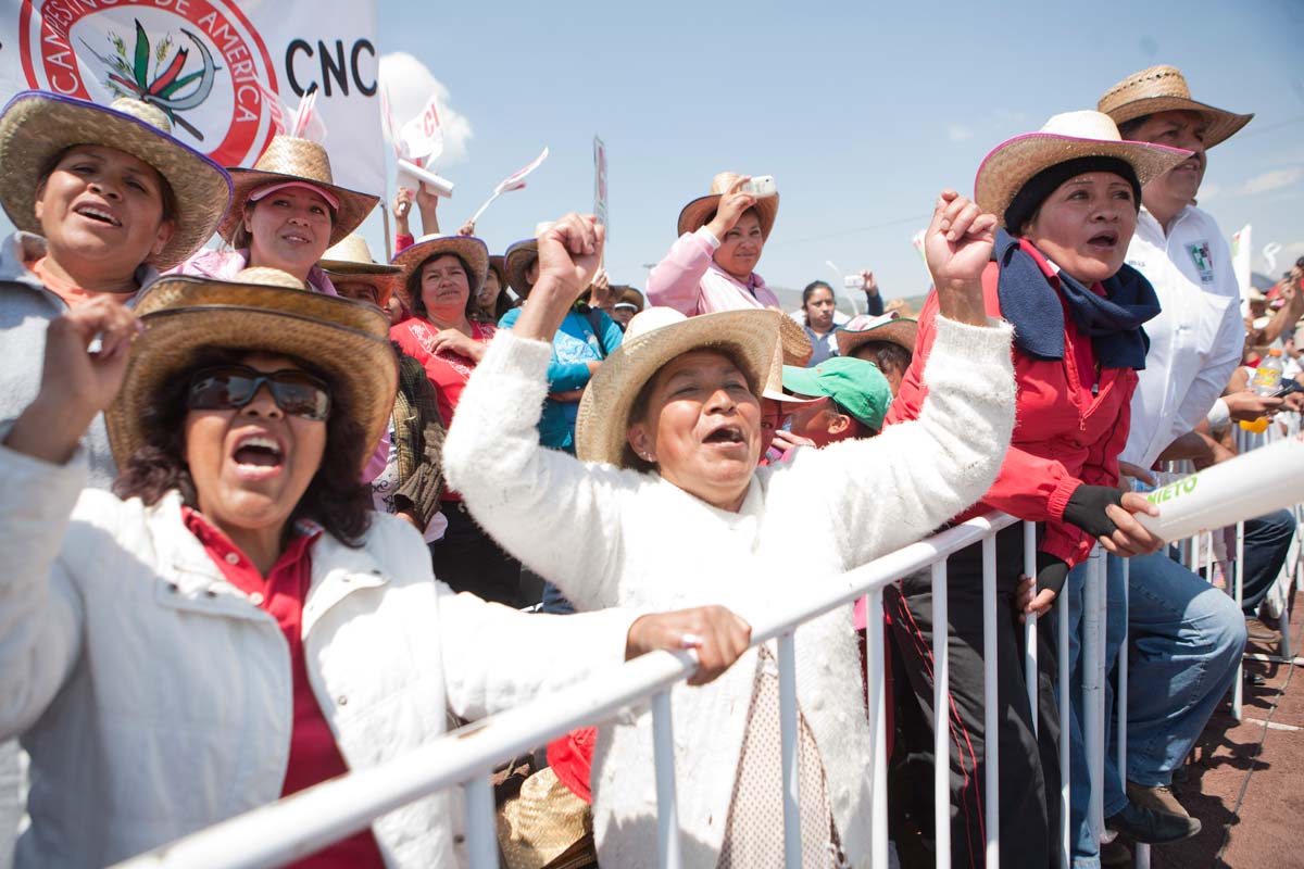 Peña Nieto acudió a este municipio a presentar su proyecto para el sector campesino. Los miembros de la CNC y de la Central Campesina Independiente fueron presionados a asistir al mitin, pues de lo contrario perderían la paga de 550 pesos quincenales que reciben.