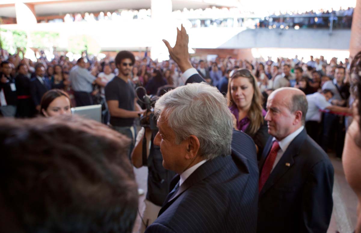 López Obrador habló en tono afable, mesurado ante los universitarios hijos de familias adineradas, en su mayoría. Otros más disfrutan de una beca o aprovechan la oportunidad para avanzar en la escala social. Los estudiantes respondieron igual, con aplausos afectuosos y gritos de respaldo al tabasqueño.