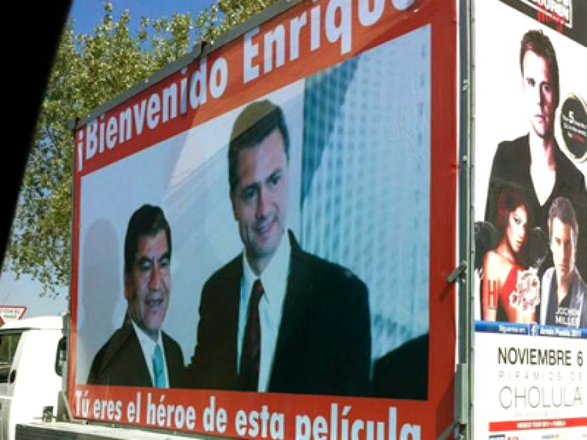 “Bienvenido Enrique, ¡tú eres el héroe de esta película!”, se leía en el anuncio, en alusión directa a la frase que el empresario Kamel Nacif dijo al entonces gobernador poblano en la famosa conversación telefónica donde lo felicita por haber detenido a la periodista Lydia Cacho.