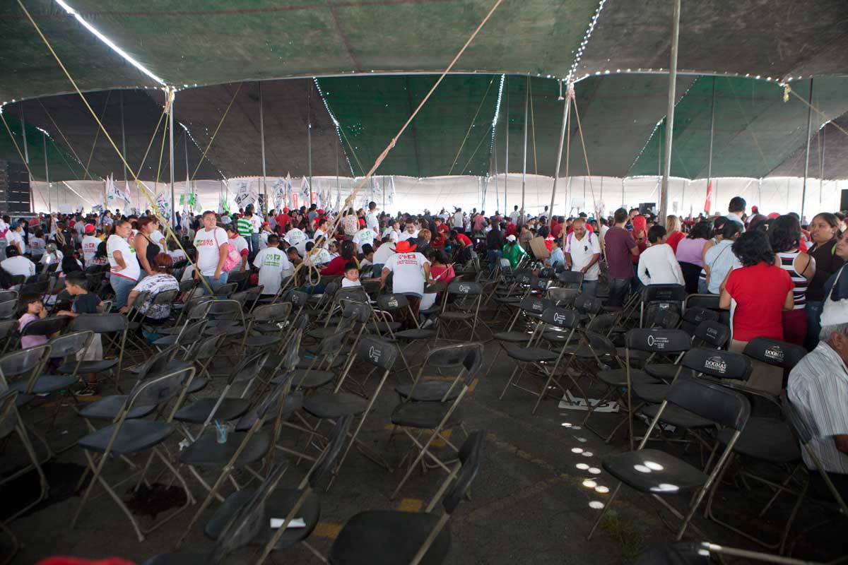El acto estaba previsto para iniciar a las 11:00 horas, pero a las 11:30 empleados comenzaron a retirar las mesas vacías, ante la falta de gente.