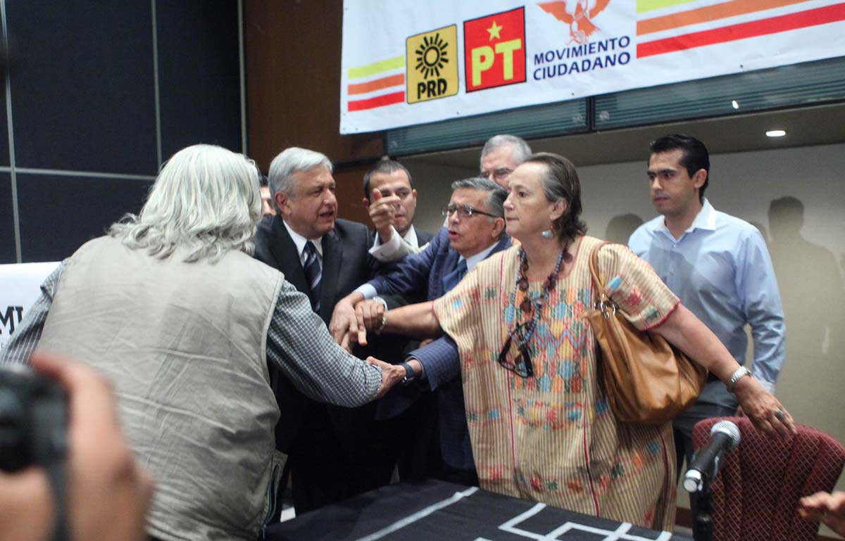 Ante la mirada atónita de Porfirio Muñoz Ledo; el candidato a jefe de Gobierno del Distrito Federal, Miguel Ángel Mancera, aspirantes a diputados y senadores, como Alejandro Encinas, e ingenieros petroleros e investigadores, un grupo de simpatizantes de López Obrador le gritó al intruso “provocador”, “fuera”.