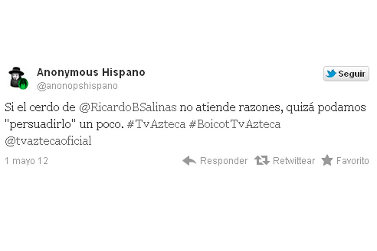 En la cuenta de Twitter del grupo de activistas @anonopshispano se lee: “Cierra tus cuentas en Banco Azteca, no compres Elektra, no veas #TVAzteca Deja de mantener a @ricardobsalinas #BoicotTVAzteca”.