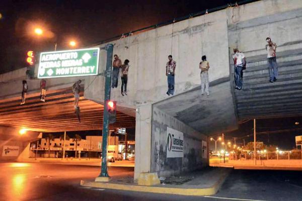 Nuevo Laredo, Tamps., (apro).- Cinco hombres y cuatro mujeres fueron colgados en un puente sobre la carretera Monterrey-Nuevo Laredo con un mensaje que los identificaba como miembros del cártel del Golfo y responsables de hacer estallar un automóvil frente a la Secretaría de Seguridad Pública el pasado 24 de abril.