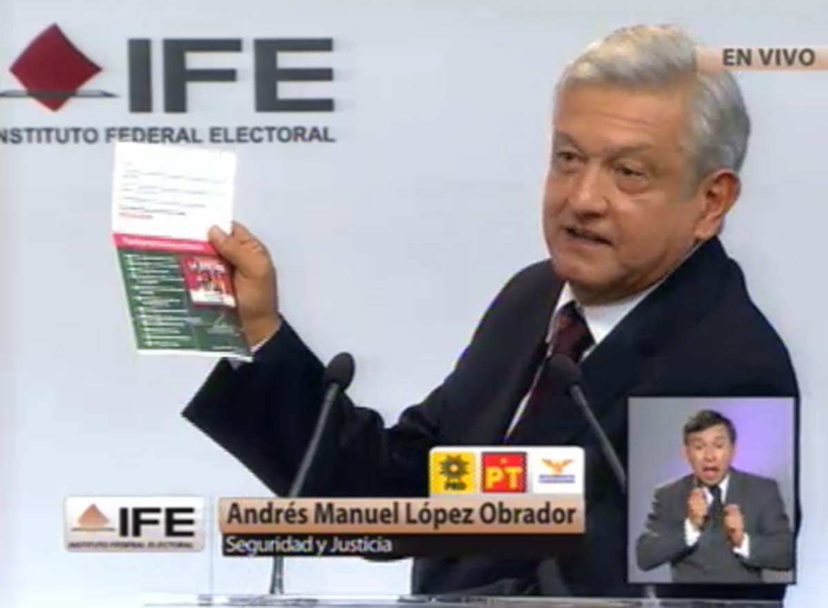 Y luego, mostró tarjetas de la campaña del ahora gobernador del Estado de México, Eruviel Ávila. Dijo López Obrador: “así ganan ustedes elecciones, lucrando con la pobreza de millones de mexicanos”.